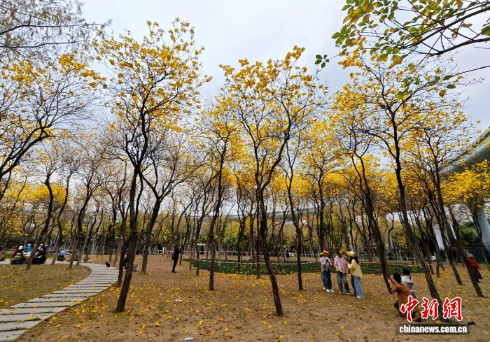 3月24日,市平易近正在祸州黄花风铃木花园内乱游历、赏花。中新社记者 吕亮 摄