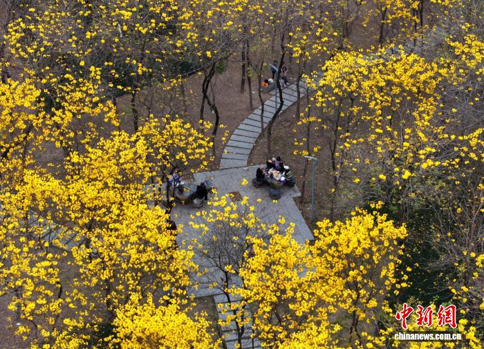 3月24日,市平易近正在祸州黄花风铃木花园内乱游历、赏花。(无人机相片)中新社记者 吕亮 摄