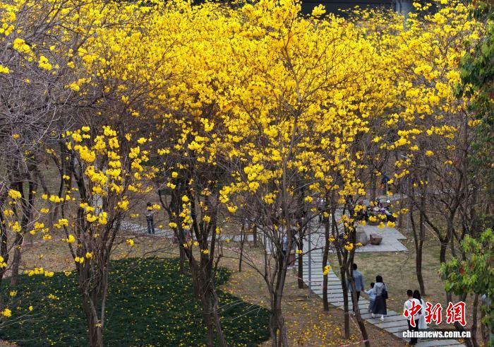 3月24日,市平易近正在祸州黄花风铃木花园内乱游历、赏花。(无人机像片)中新社记者 吕亮 摄