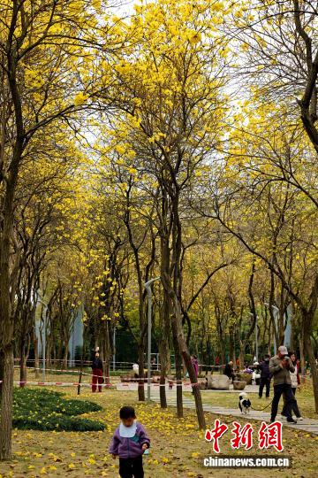 今日市平易近正在祸州黄花风铃木花园内乱游历、赏花。中新社记者 吕亮 摄