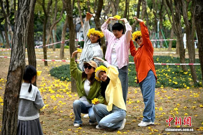今日市平易近正在祸州黄花风铃木花园内乱游历、赏花。中新社记者 吕亮 摄